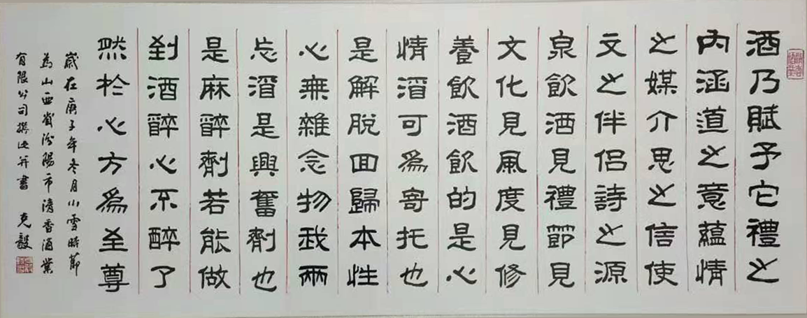 汾陽市清香酒業(yè)有限公司座落在中華名酒第一村---杏花村申明亭路9號。《汾酒曲》中記載,申明亭畔新淘井,水重依稀亞蟹黃 ,注解說:申明亭井水絕佳,以之釀酒,斤兩獨重。明末愛國詩人、書法家和醫(yī)學(xué)家傅山先生,曾為申明亭古井親筆題寫了得造花香四個大字,說明杏花井泉得天獨厚,釀出的美酒如同花香沁人心脾。 汾陽市清香酒業(yè)有限公司出品的清香型高端白酒用的是優(yōu)質(zhì)高粱、大麥和豌豆等上等原料和申明亭地下礦泉水,再加上杏花村土壤和空氣中獨有的菌群,在杏花村釀酒匠人的傳統(tǒng)工藝下精心釀造:清蒸二次清,固態(tài)地缸分離發(fā)酵,清字當(dāng)頭,一清到底,釀出的酒:酒液晶亮、清香幽雅、醇凈柔和、回甜爽口、飲后余香,在國內(nèi)外享有盛譽。